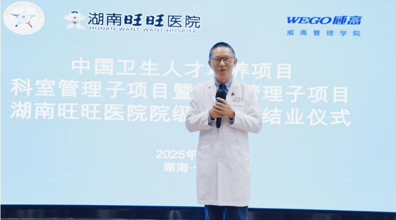 湖南旺旺病院院长蔡有权正在卒业典礼上致辞显示,为期一年半的威高解决课程对病院的兴盛起到了首要的督促效力。